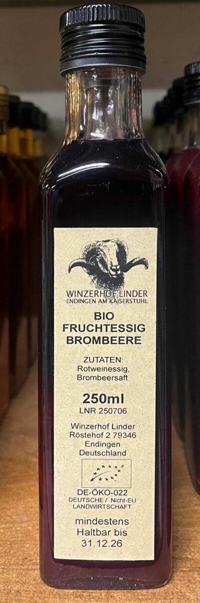 Der BIO Fruchtessig Brombeere besteht zu 50% aus Rotweinessig und 50% Brombeersaft aus wild gesammelten Brombeeren aus unserem pestizidfreien Weinberg. Er ist zuckerfrei produziert und auch der Brombeersaft wurde nicht mit Zucker angedickt. Wenn sie den Essig als zu sauer empfinden fügen Sie bitte selber Süße zu ihren Speisen hinzu.